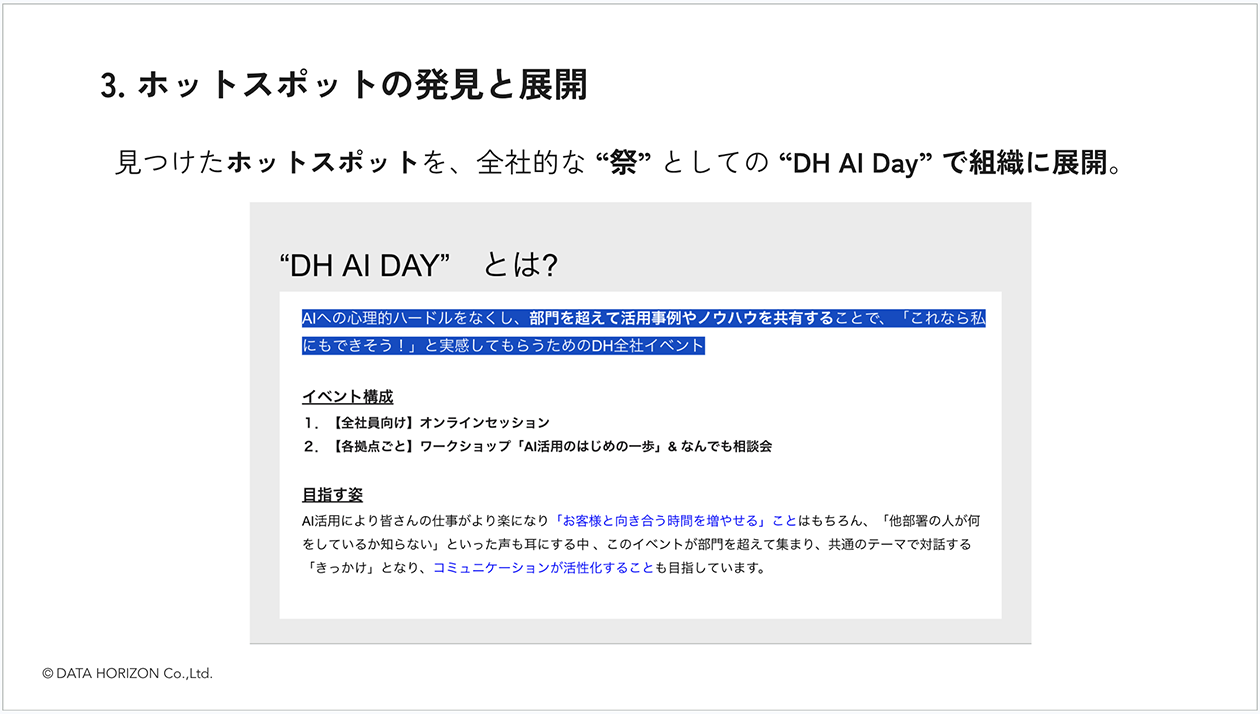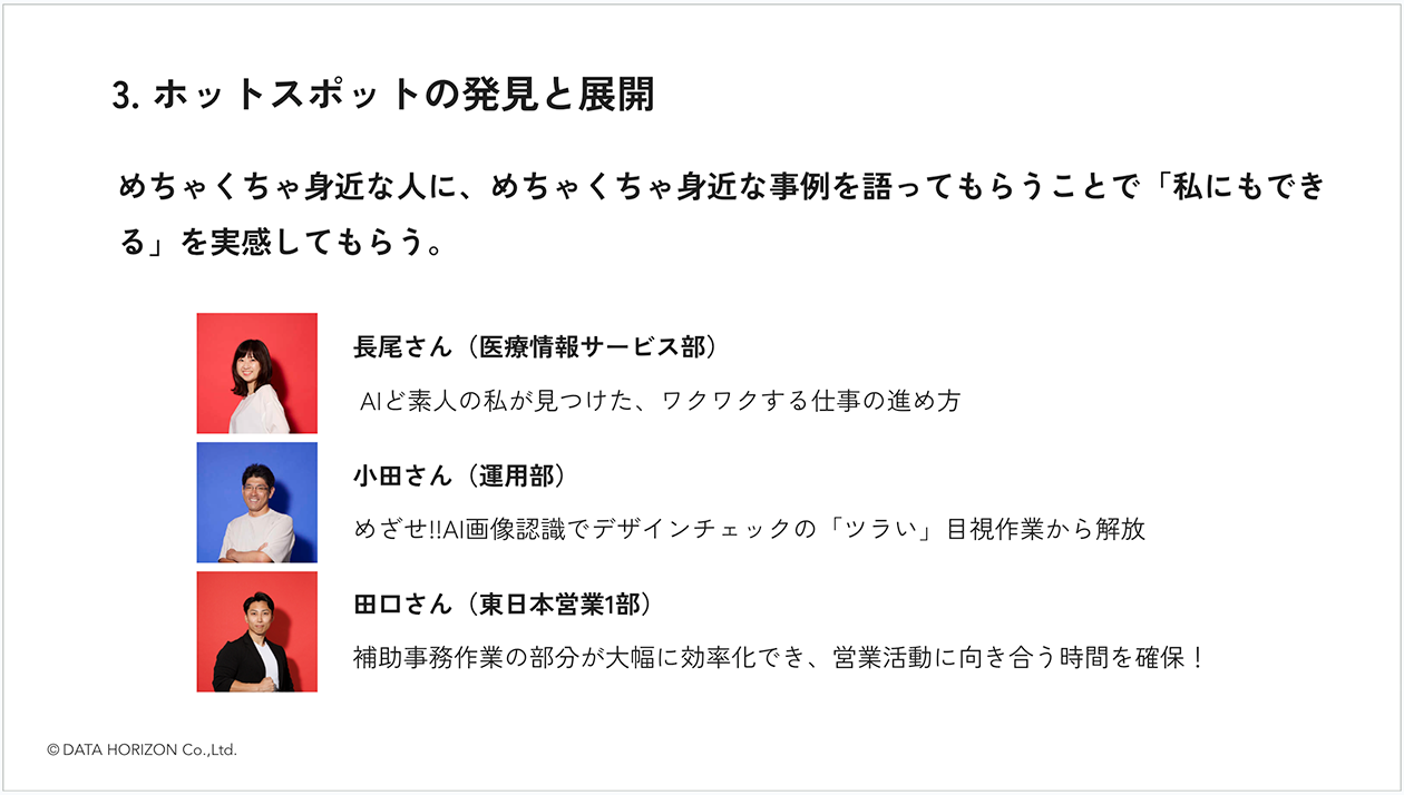 ──そして、3. の「ホットスポットの発見と展開」について。これは1つ目の「ビジョンと危機意識の共有」にもつながるイメージがありますが、各所で見つけるというのは実際どんな動きをされているのですか?